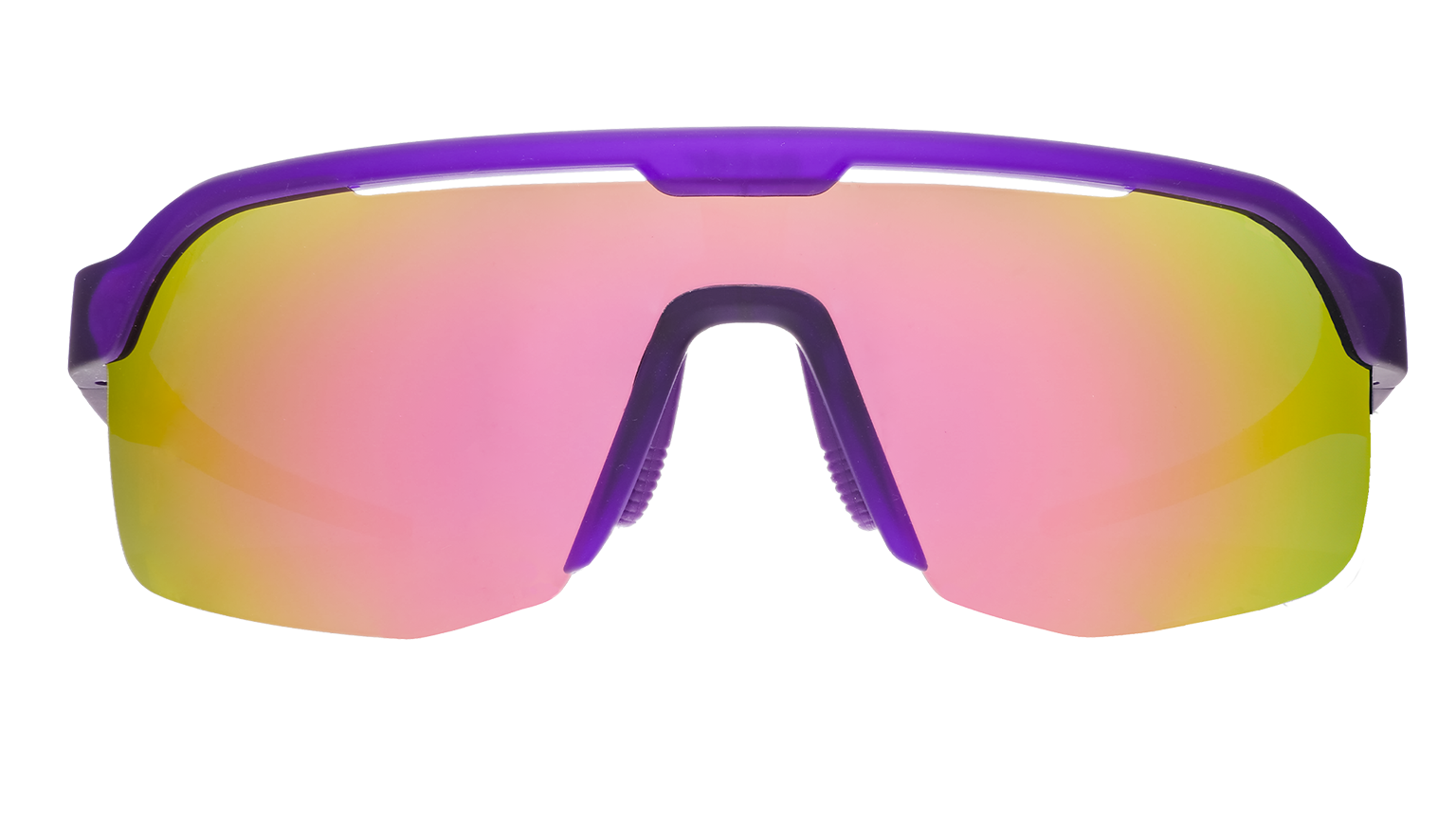 TAG, you’re IT in these purple shield sunglasses w/ half-rim frames & light pink reflective lenses. Channel your inner cephalopod’s athletic abilities in these baddies. (Get real, does having eight arms give you an unfair advantage when playing tag?)